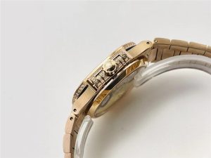 ?表鏈:選用1729顆鉆石,選用罕見的“不規則雪花鑲鉆”工藝,為手表增添耀眼光彩。這個過程需要嵌入和固定不同尺寸的鉆石,并盡可能隱藏每顆鉆石之前的貴金屬痕跡。