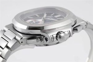 首先,我們來看一下這款表的外觀設計。5980采用了經典的Nautilus風格,表盤和表殼之間的邊框呈現出特殊的幾何形狀,非常獨特。表盤上的水平條紋紋理和立體的時標和指針都非常精致,而且在光線的照射下會呈現出非常美麗的反射效果。此外,這款表也非常注重細節處理,比如表冠和按鍵都采用了鉆石紋理的設計,非??季?。