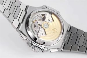 華麗的表盤,靈感來自第一只百達翡麗Nautilus的表盤顏色。但具有更豐富的色調。位于6點鐘位置的單計數器計時碼表實際上就像在手表內部裝有另一只手表。讀取經過的時間再簡單不過了,因為小時和分鐘是在一個12小時的寄存器中計算的。3點位置的日期孔完善了表盤的設計。