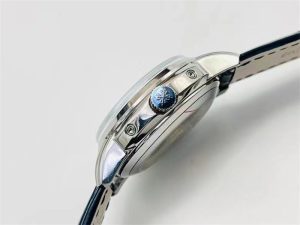 ?直徑40毫米一體沖壓成型的雙層式精鋼表殼,致敬了經典的設計語言奶油色的表盤營造復古氛圍,表盤邊緣刻印有密分秒數刻度,配金質阿拉伯數字及五分鐘凸圓刻度字釘,更有立體感。時分指針以巴頓式設計為基礎,配以尖長的針尖,這特色造型是呼應了 1950 年代 Ref. 1463 計時碼表的指針。?表盤6點位置是月相顯示和日期分撥。所有的萬年歷標志都很好,一眼就能讀懂。內里搭置了仿324 S Q 自動上鏈機芯,是 324 自動上條傳奇機芯的精裝版本。機芯夾板橋經倒角,邊緣作細意打磨,主夾板飾以魚鱗紋,而夾板則綴以日內瓦波紋,夾板表面有包金雕刻,螺絲凹槽經打磨和倒角,連鉆孔亦同樣經打磨處理。搭配朱古力啡色牛皮表帶,進一步帶出復古氣息。