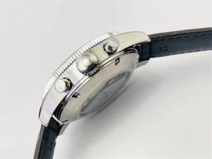 ?表盤有黑色和藍色,3點位為計時盤、9點位為小秒盤,中央大秒為計時大秒針。表盤上6點位標注了“FIyback”飛返功能,是非常便捷的計時碼表。