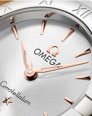 腕表表圈有兩種設計,璀璨的鑲鉆表圈以及鐫刻羅馬數字的拋光表圈。單鏈節表鏈搭配蝴蝶表扣,設有歐米茄研發的可調節功能,可額外延展2毫米,細節精致且佩戴舒適。