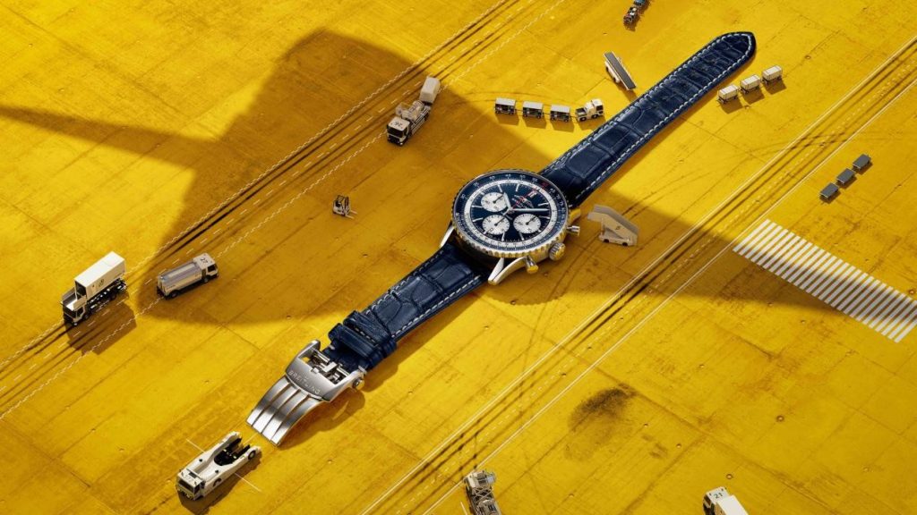 航空計時B01計時碼表43致敬協和式飛機限量版采用深藍色表盤,色調靈感源自協和式飛機高空飛行時所見的平流層景致,并搭配同色系鱷魚皮表帶。對比鮮明的白色小表盤與內圈環形飛行滑尺,巧妙呼應了協和式飛機“白鳥”的昵稱,細節之處盡顯致敬之意。