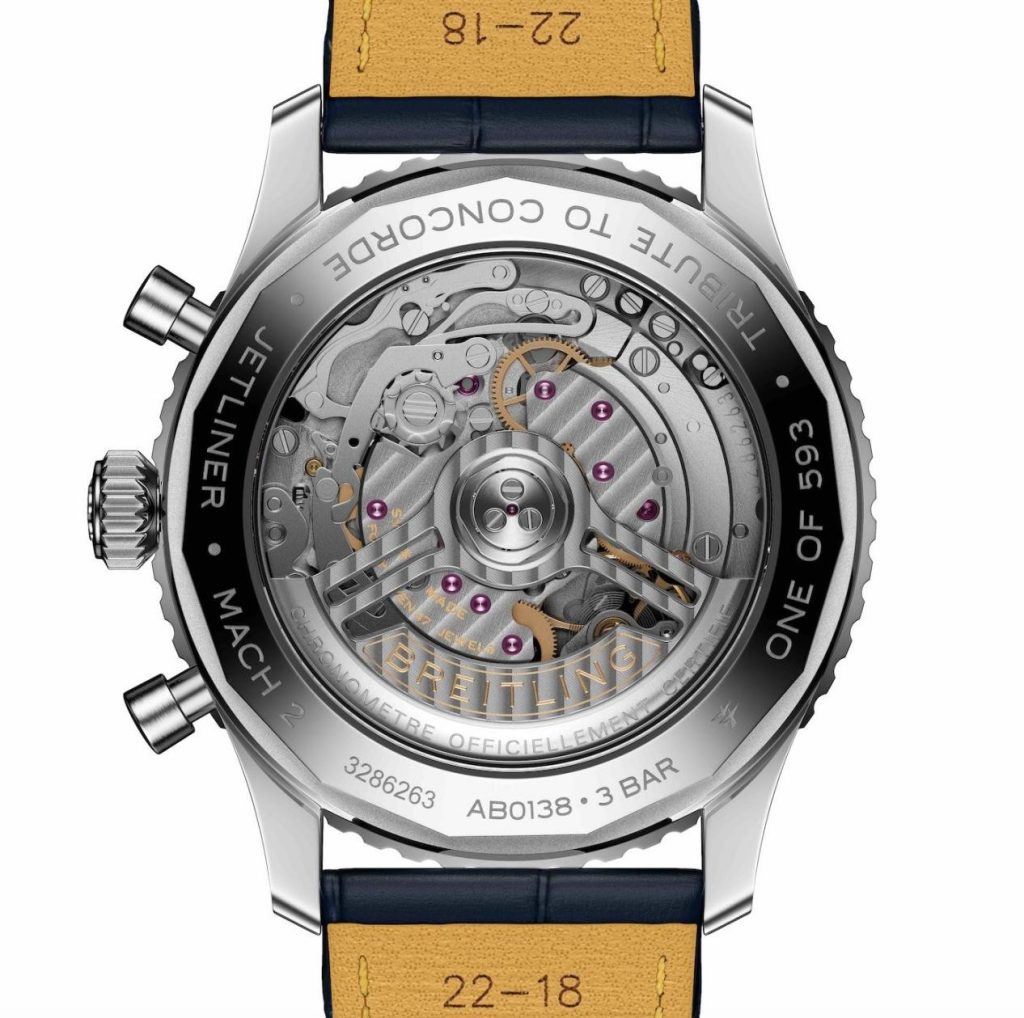 該腕表限量發行593枚,數字致敬為協和式飛機提供動力的奧林巴斯593型渦輪噴氣發動機。表底蓋鐫刻有“One of 593”(593枚之一)、“Tribute to Concorde”(致敬協和式飛機)、“Jetliner”(噴氣式客機)及“Mach 2”(2馬赫)字樣,其中“Mach 2”代表著協和式飛機突破音障的巡航速度,定格了這架傳奇飛機的核心成就。