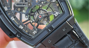 近距離觀察宇舶906陀飛輪腕表的表盤細節,可以看到黃色條形刻度設計給人以強烈的沖擊,在陽光下非常耀眼。這款腕表的另一個特點是表盤設計的機械感,獨特而時尚新穎。表盤上有雙時標和分標,劍形的時針和分針中間也是鏤空的,并填充了醒目的黃色材料,讓人更容易看清時間。位于六點鐘位置的陀飛輪是該表的核心,是真正的陀飛輪機芯,而不是裝飾品。我曾教過你如何通過觀察擒縱機構是否一起工作來區分真正的陀飛輪和假的。如果是那種左右搖擺的,那就是假陀飛輪。陀飛輪可以說是讓所有人著迷的功效,盯著它看就像一個視覺漩渦,非常吸引人。