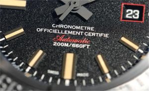 字面上的第一感覺是非常干凈細致。字跡清晰,12點的百年靈logo它非常三維,看起來不錯。字體是一致的,字母是一致的。指針也使用瑞士的非常發光作為表盤。經過無數次的調整,表盤的粒度最終與原來的粒度相同。在三點鐘的位置,在紅色的日歷窗口中,與內部黑色陰影刻度對應的字面刻度非常整潔。可以看出,字面上的中心孔也經過了精細的拋光,形成了一個沒有倒鉤的弧形。瑞士進口指針長度、指針和表盤刻度上的有光涂層C3發光粉,發光效果飽滿圓潤。第二針尾端為紅色,GF工廠注意到中心軸的所有細節都是空心的。指針的細節得到了很好的控制。沒有缺失的點或黑色層接觸到明亮的層。單向棘輪旋轉表圈與四個表圈指示器一致,使操作更加方便,確保最終準確的飛行和潛水時間。