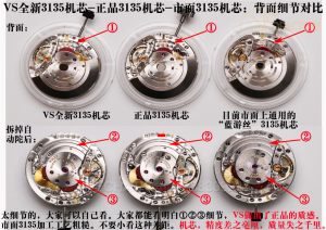 銑花,市面復刻3135機芯外觀銑花處理很淺不清晰,且光亮的就好像不銹鋼鋼盆,材質很光亮(很反光),即使不同角度看,質感都很低端。機芯加工的水準差別,其本質是機芯制造工廠實力的差別,工廠的加工設備、技術人員的差別。如果連外觀簡單的銑花工藝都處理不好的工廠,你們能相信這種工廠能夠制造出高精度、質量穩定的機芯嗎?我們后面對比圖大家可以清楚的看到VS廠3135機芯做出了正品的效果,立體換裝銑畫效果明顯。