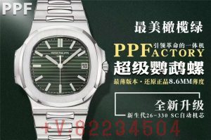 PPF超級鸚鵡螺?更“芯”換代Cal.26-330SC.?已知正版機芯324SC宣告停產,由330SC替換!PPF精益求精,緊隨其后,正式推出與正版一致的330SC機芯!330SC機芯將是PPF接下來的主力自動機芯,將超薄自動、打磨裝飾、走時性能,三者完美結合在了一起。機芯厚度只有3.3毫米.同時有百達翡麗雙P印記,機芯打磨裝飾盡善盡美,所有機芯部分都進行了打磨,代表了主流名表的最高水平。機芯使用無卡度砝碼微調擺輪,硅游絲,21K金自動陀,擺頻28800次/時,動力45小時。同時,手表走時符合百達翡麗印記標準.加之PPF完美克隆的表身,更是一騎絕塵,超群絕倫!PPF超級鸚鵡螺的真正締造者!