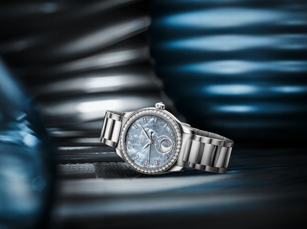 心蘊萬象,自成光華。這枚腕表,是優雅與獨特的共生,是精致與堅韌的融合,完美詮釋當代女性的多元魅力,從容綻放不被定義的氣質。超薄珍珠母貝表盤暗藏巧思,背面經數層深色漆面悉心涂覆,與珍珠母貝本身的天然瑩潤光澤交相輝映,隨光影流轉,色彩便從清淺銀藍緩緩暈染成濃郁煙藍——這正是都市天際線的靈動寫照:平視時,玻璃幕墻映出純粹澄澈的藍;抬眼間,流云掠過,又在鏡面上投下萬千變幻的光影。格拉蘇蒂原創巧妙捕捉這份輕靈縹緲的詩意,將現代建筑的恒久磅礴與天空的澄澈悠遠,一同凝刻在這方寸表盤之上。